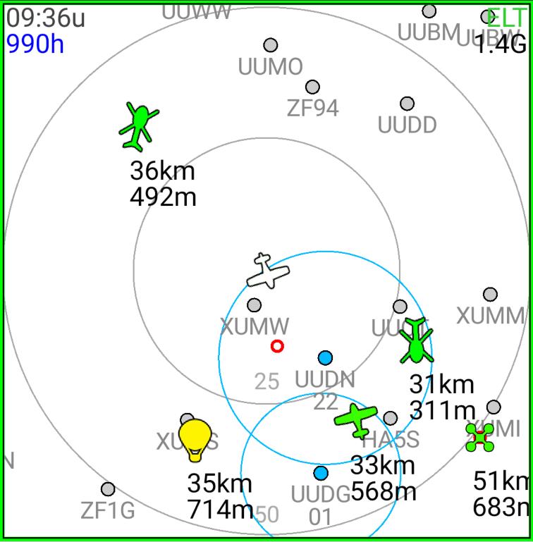 Отображение других ВС в радиусе до 100 км с обменом данных по GSM каналу при наличии связи